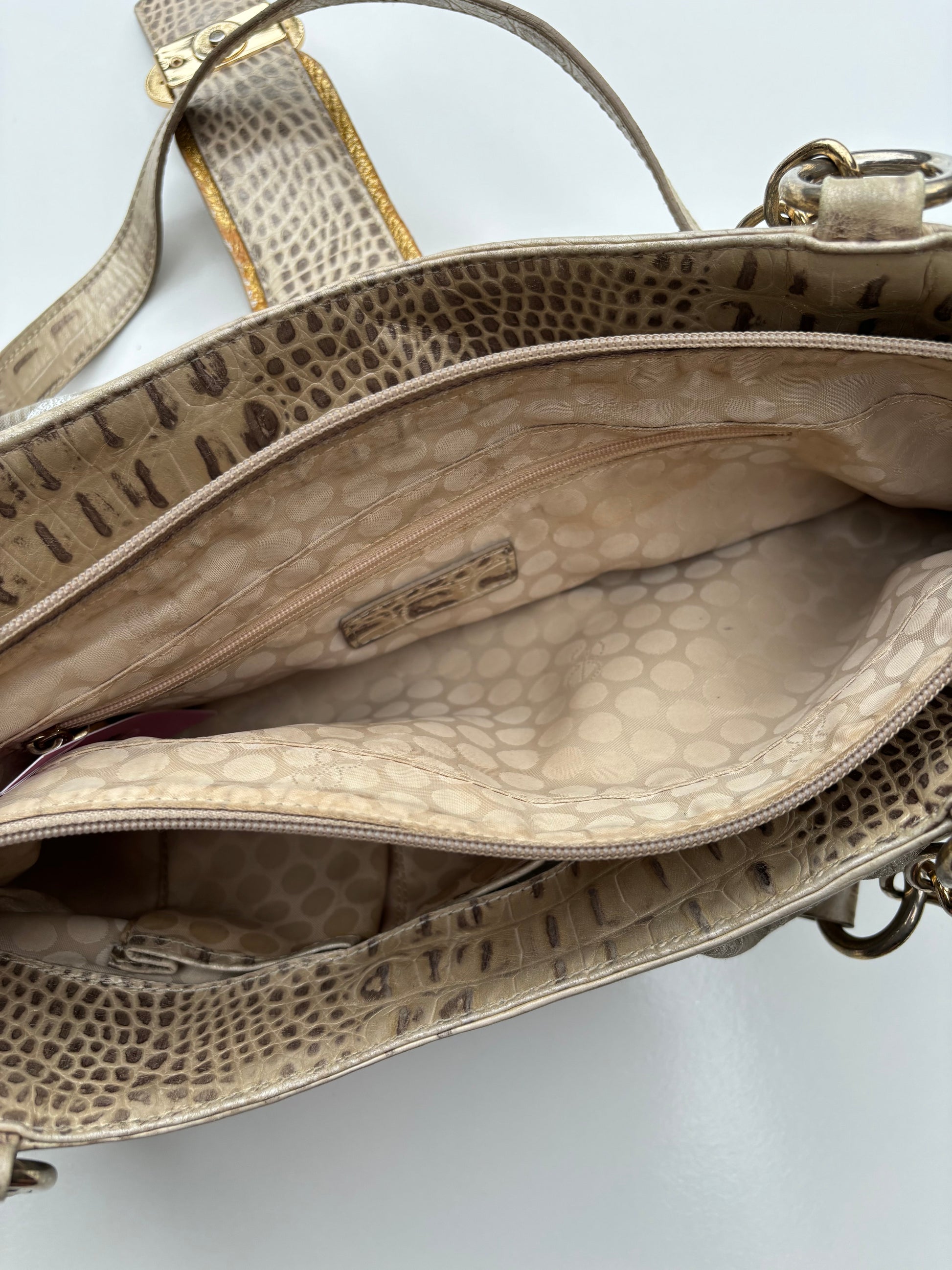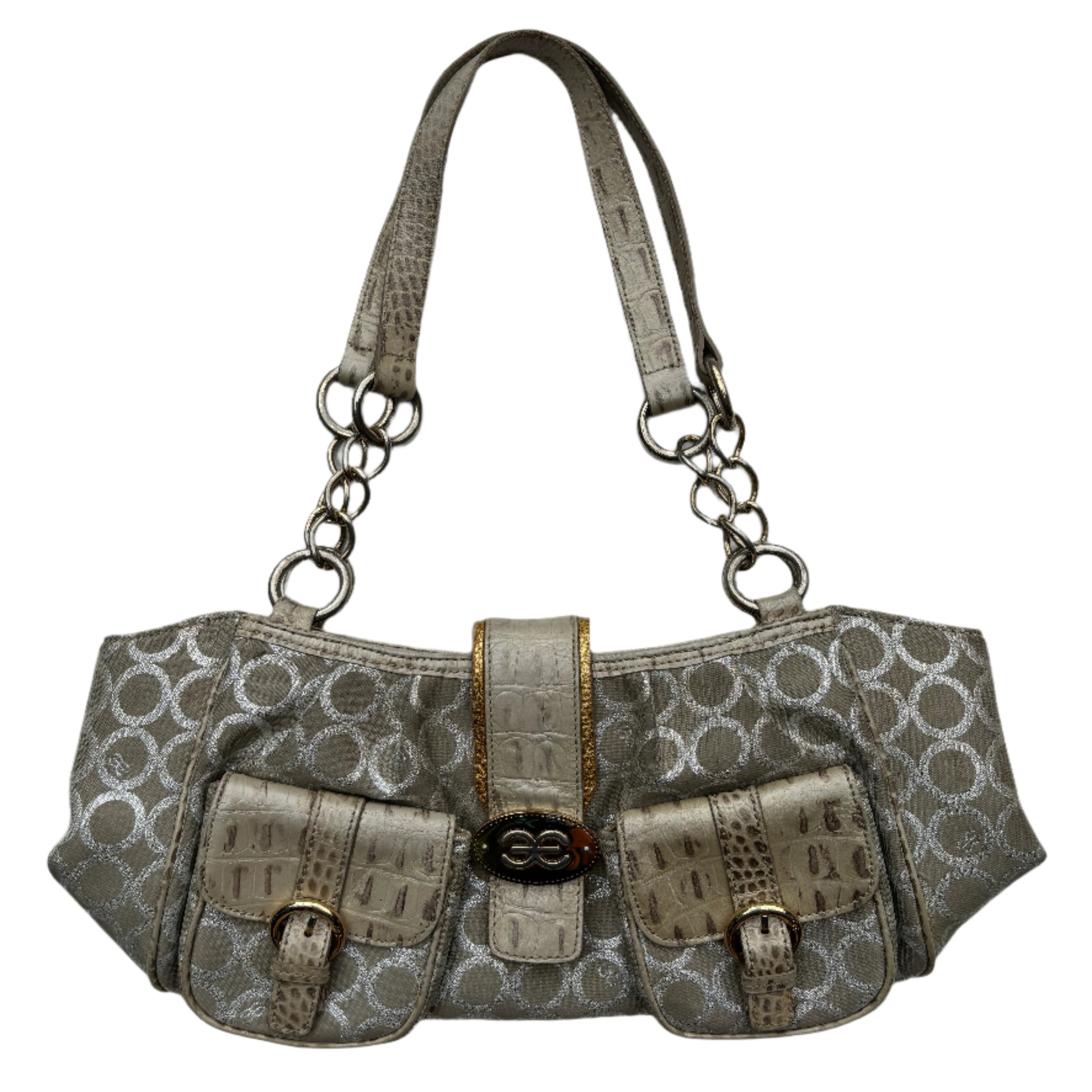 Insane Paris Hilton type shoulder bag. Stone cream colour way with croc design. Silver glitter circle pattern. Two front buckle pockets. Inner divider compartment with zip compartment. Perfect size for all the necessities.