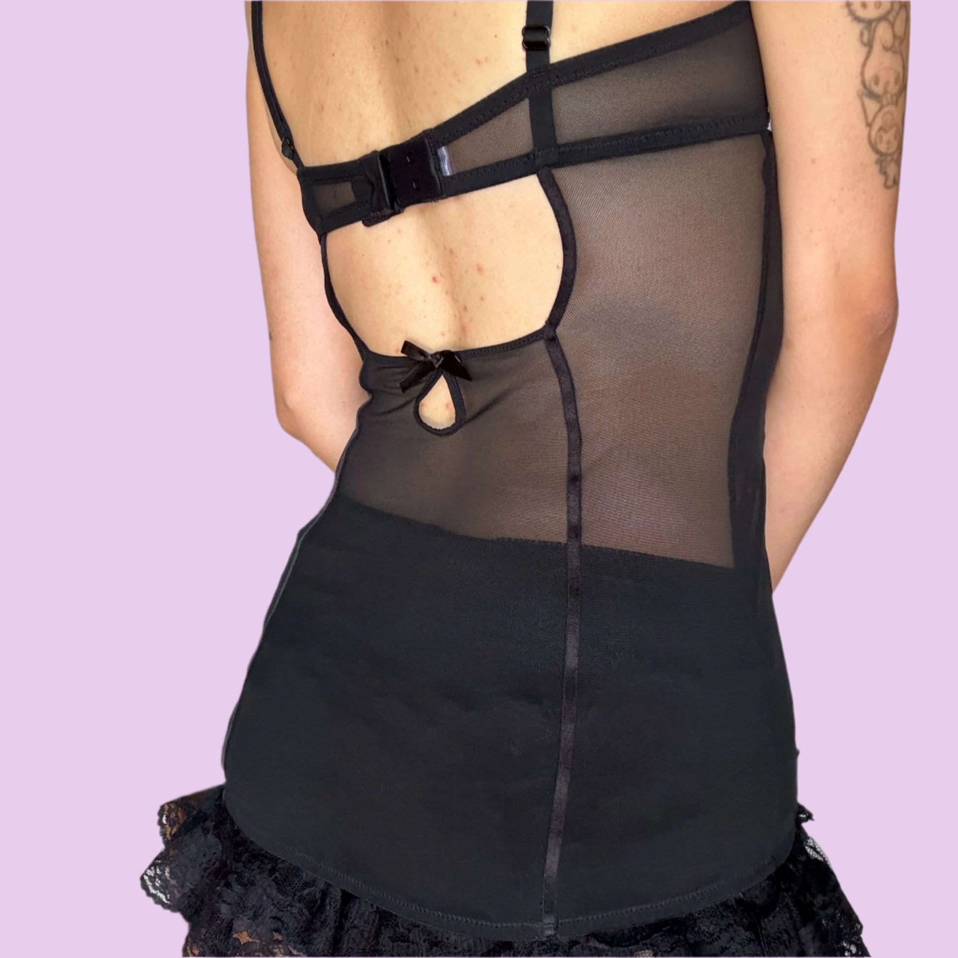 Most beautiful baby blue satin corset. Black lace embroidery detail on the bra cups. Black mesh back with the cutest keyhole bow detail. Adjustable straps. Adorable bow detailing on the hem.