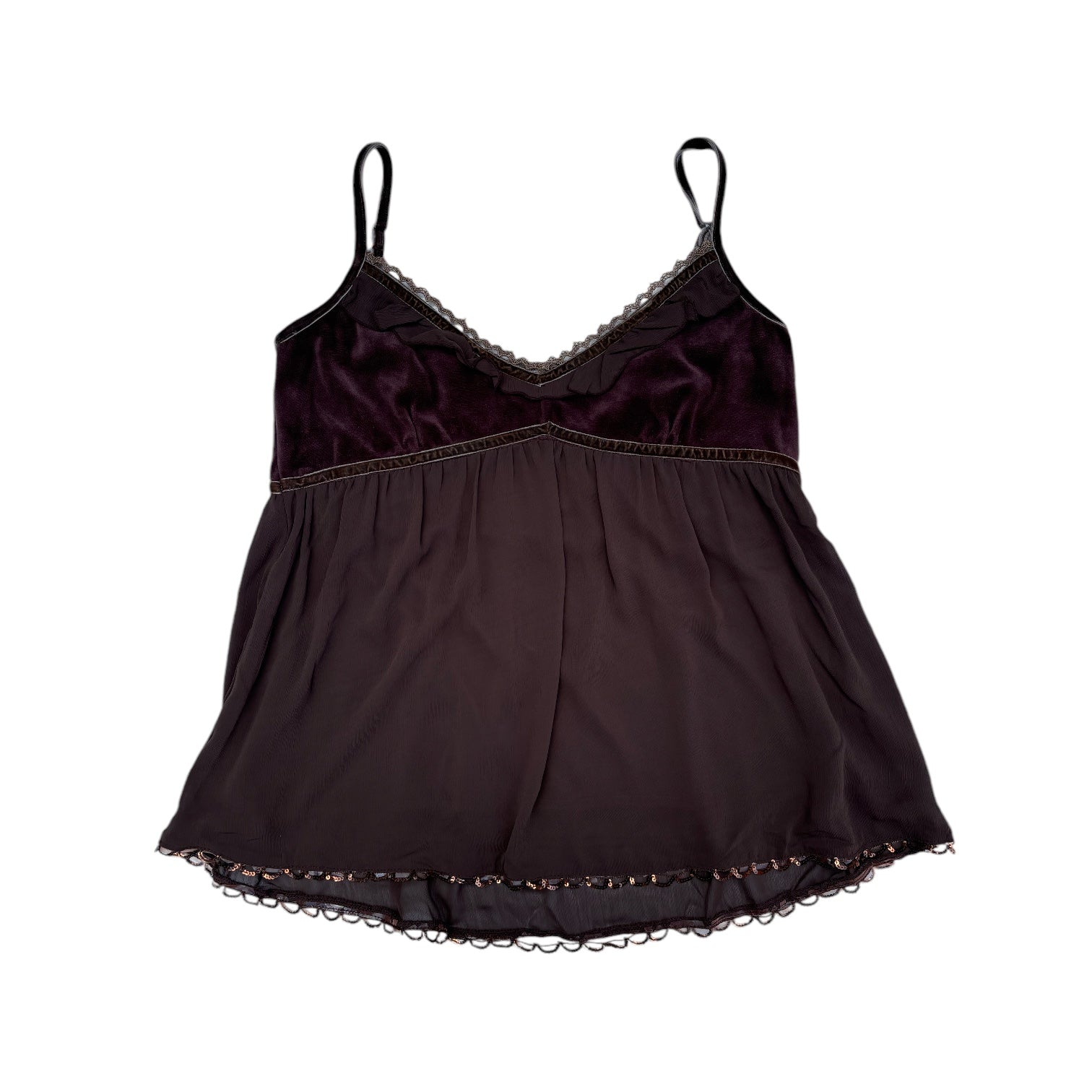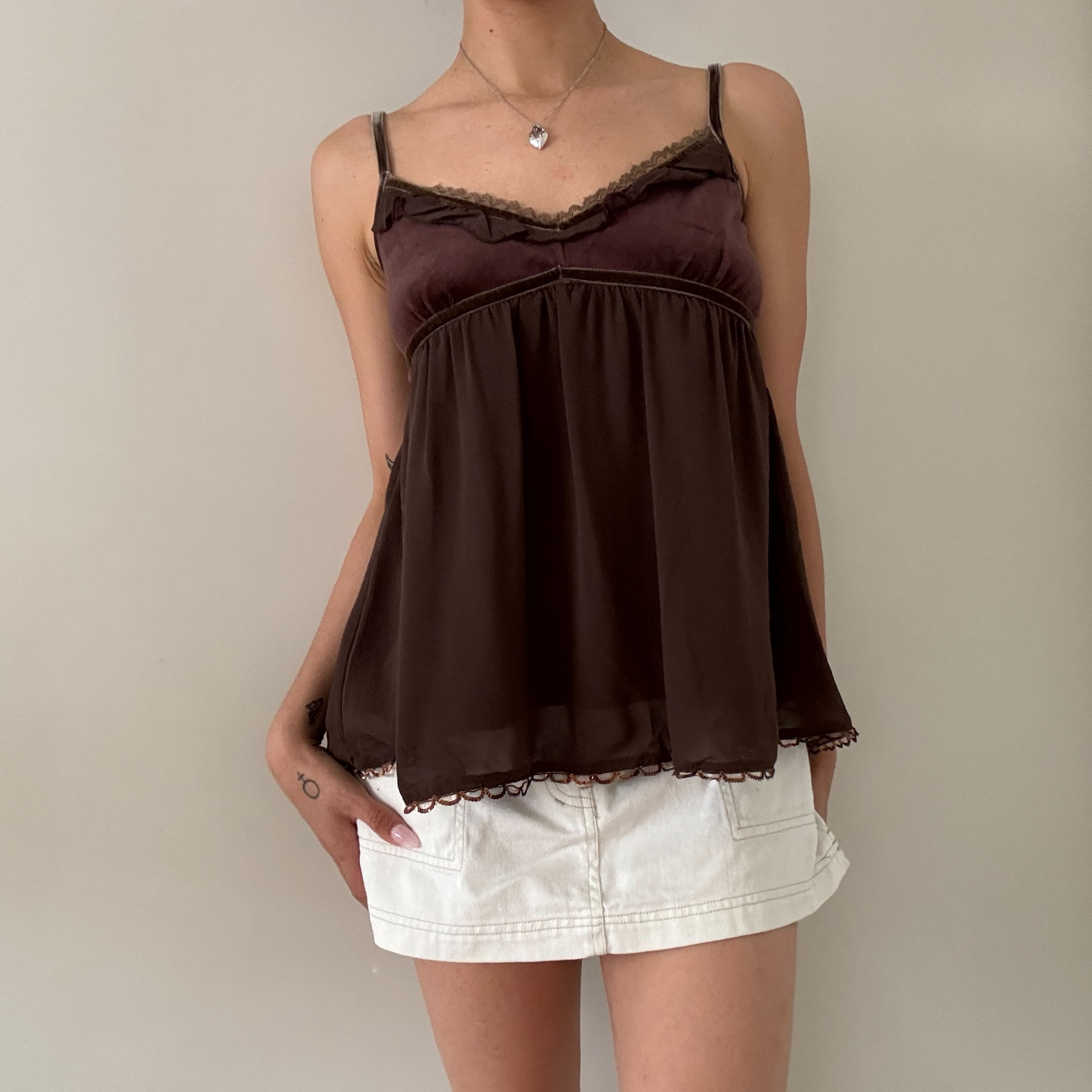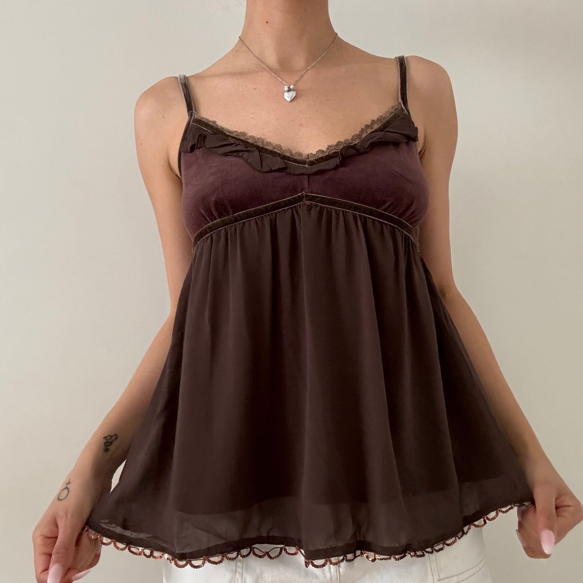 Beautiful chocolate brown camisole. Velvet bust with a ruffle lace trim neckline. Adjustable straps. Sheer material with satin inner lining. Cute sequin scallop hem.