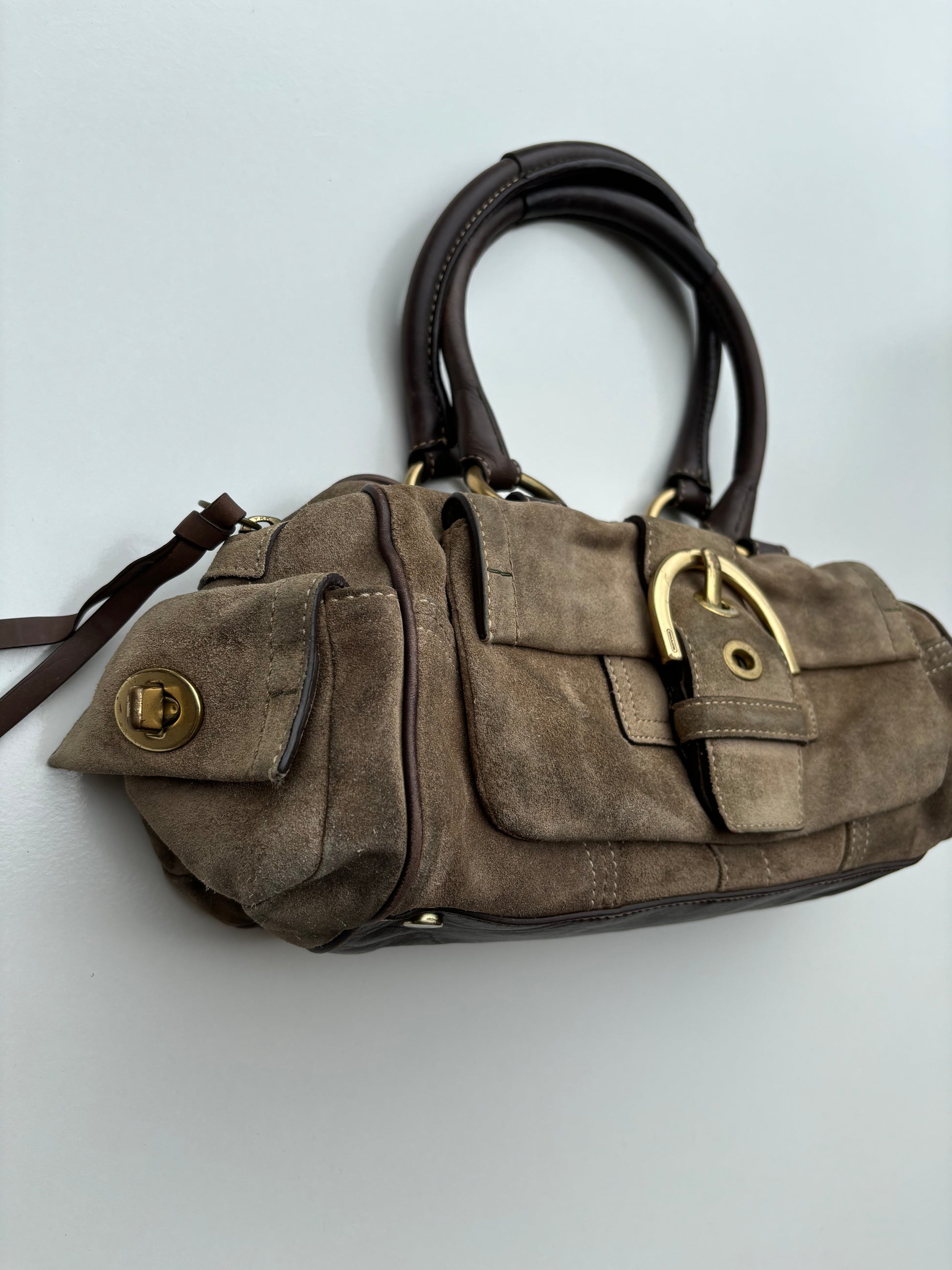 NY It girl incoming... The perfect vintage small coach bag. Cutest brass buckle snap pocket feature. Dark stone suede material. Gold hardware with leather details. Mini side pockets with turn lock closure. Inner pockets with zip compartment. Authentic coach leather patch code.