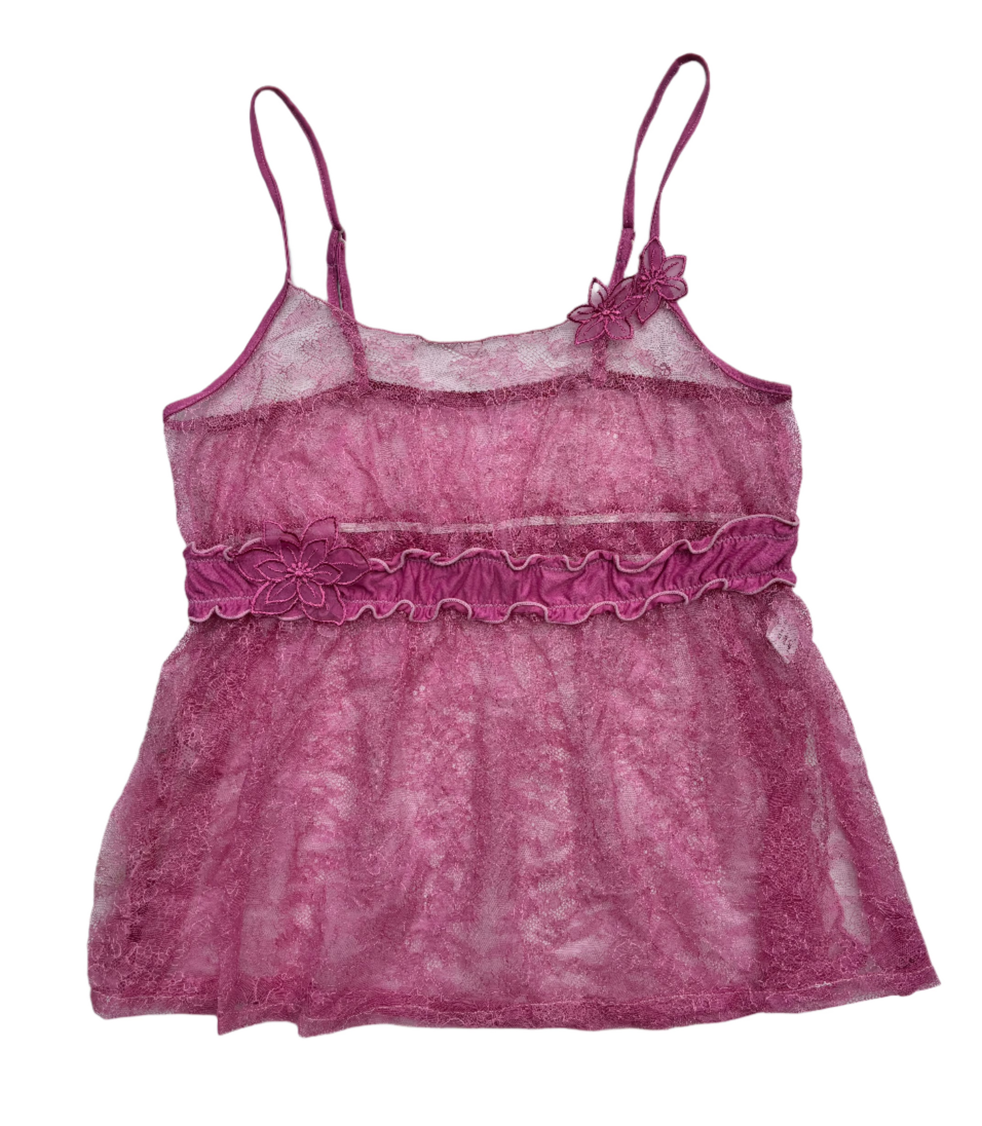Adorable berry pink camisole in floral lace. Ruched underbust with floral patch detail. Adjustable straps. 2000s Mandy Moore vibes.