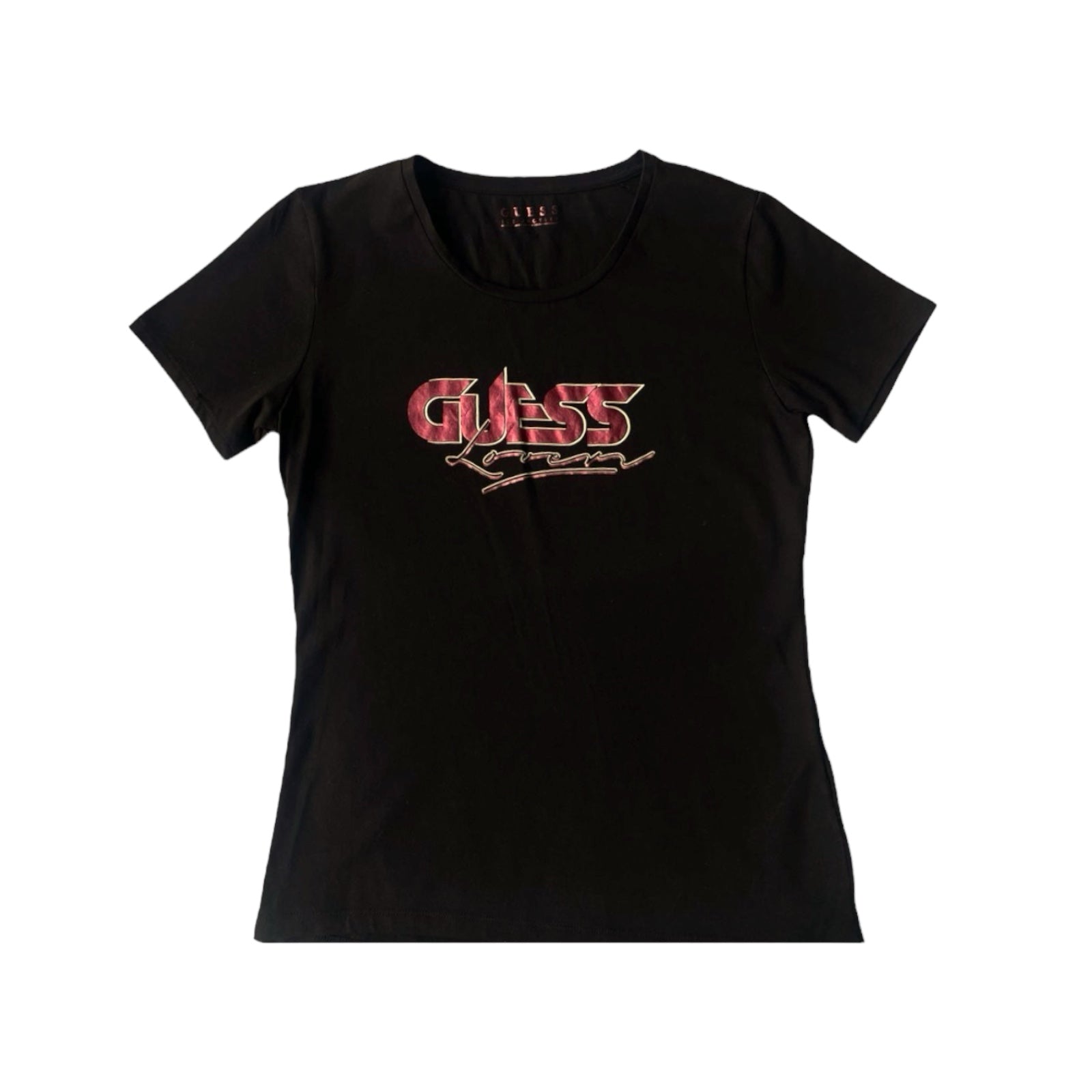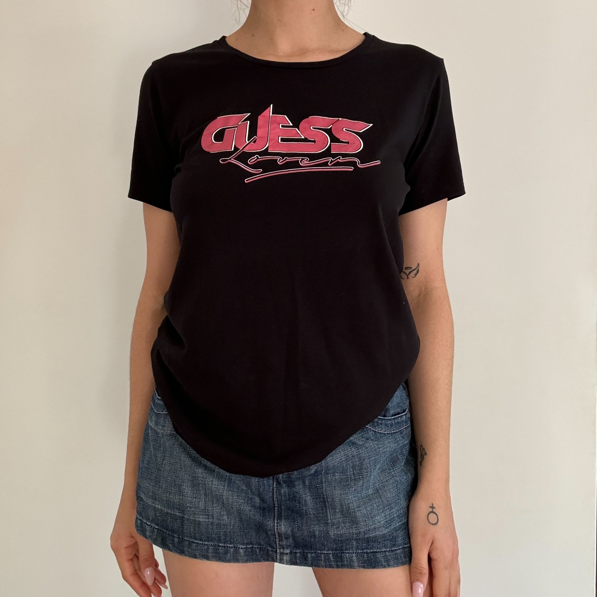 Black cotton fitted T-Shirt from Guess. Cyber 00s metallic 'Guess Lover' graphic.