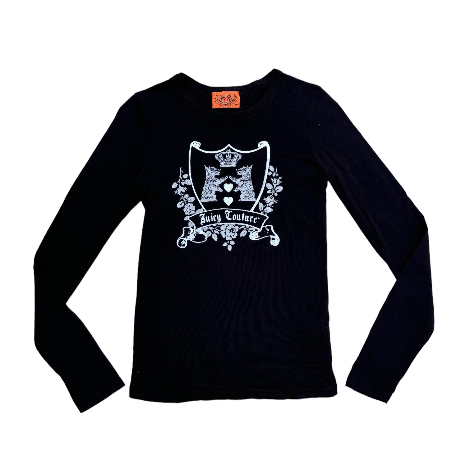 Early 2000s Juicy Couture Cotton Long Sleeve Top in Black. Metallic silver Scottie Dog Crest graphic with '22' on the back.