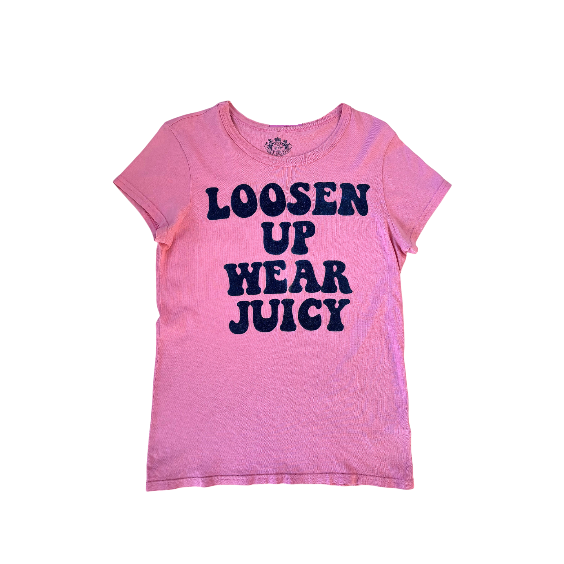 Early 2000s slogan tee from Juicy Couture. Blue glitter detail on font graphic. Full length.