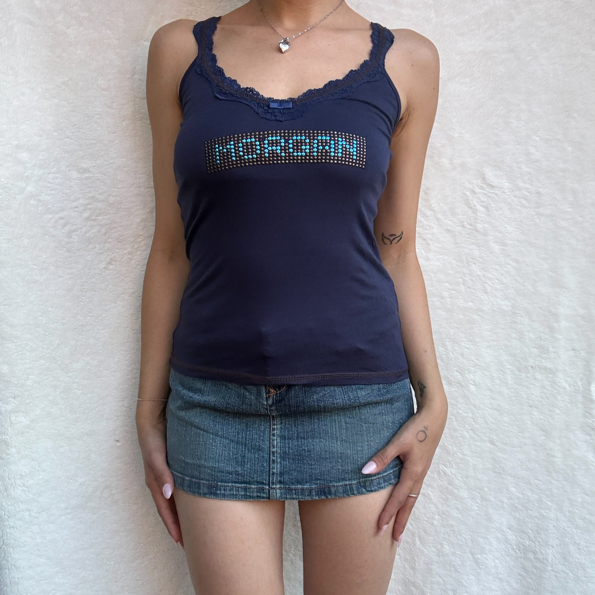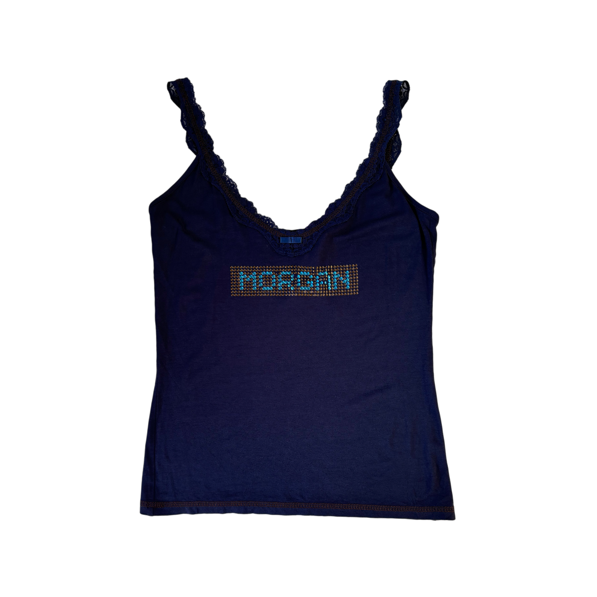 Beautiful navy cami with a lace trim neckline and straps. Studded sequin 'Morgan' design.