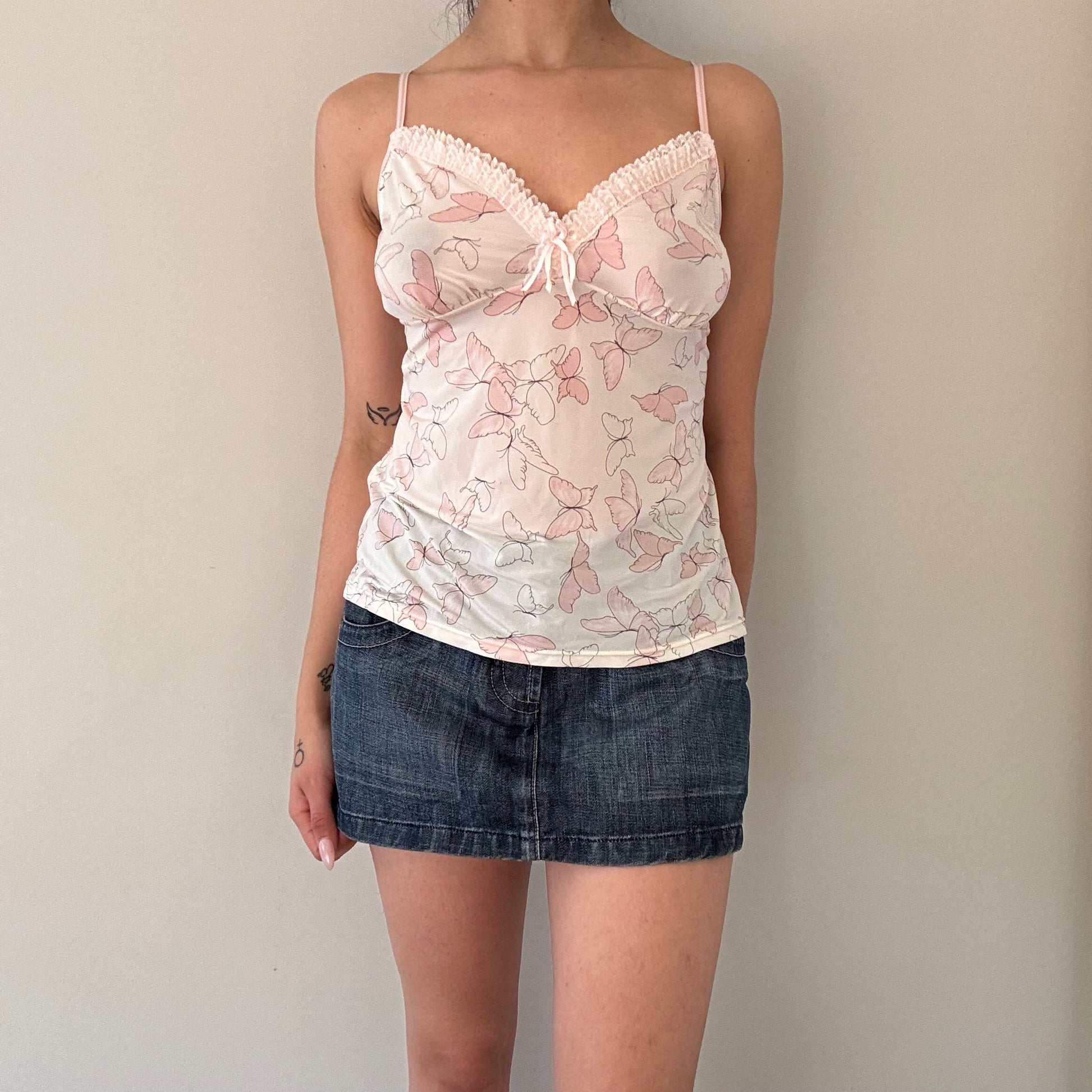 Gorgeous baby pink camisole with all over butterfly print. Coquette style ruffle trim with bow detail on neckline. Adjustable straps.