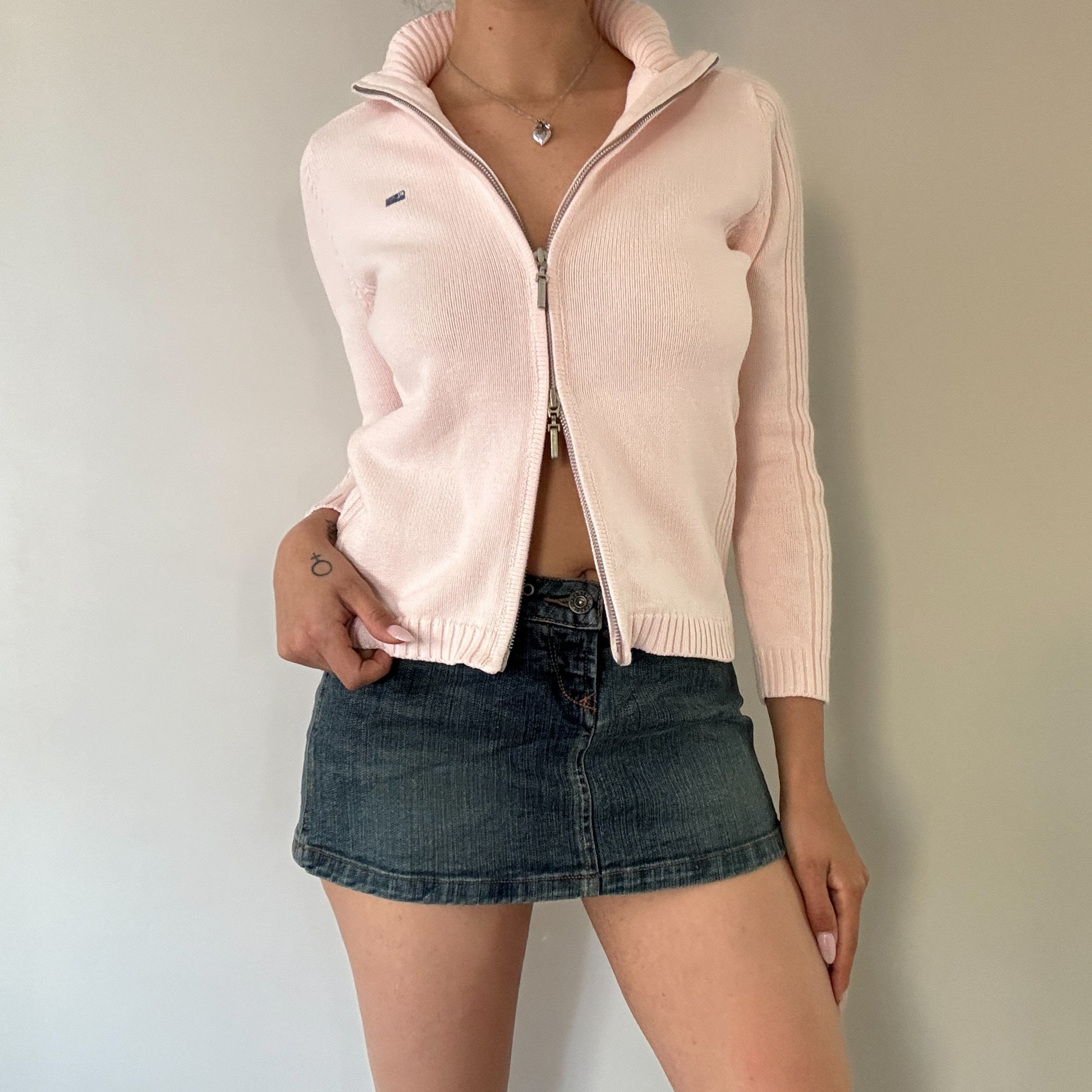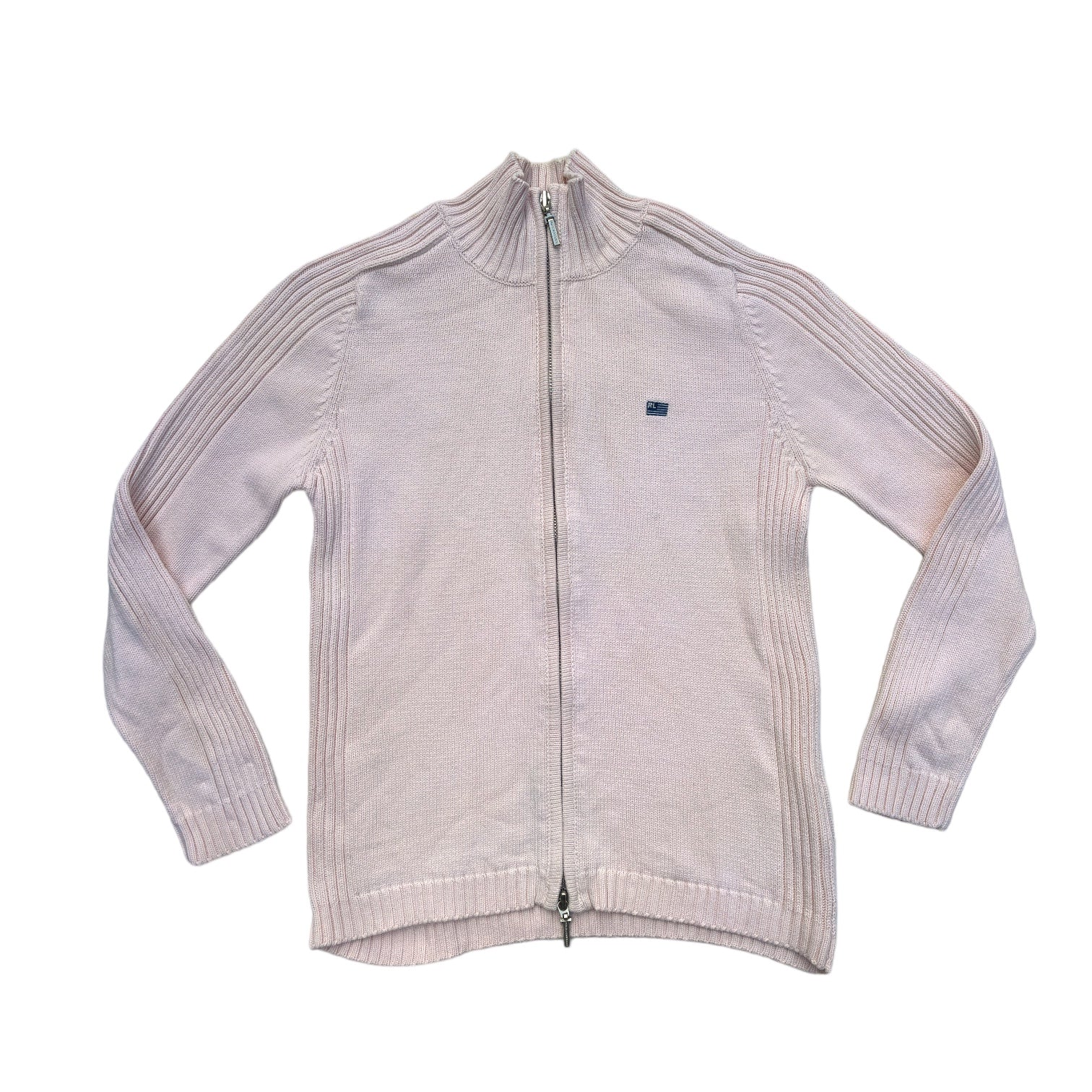 Soft powder pink double zip jacket from Polo Jeans Company by Ralph Lauren. RL flag embroidery design.