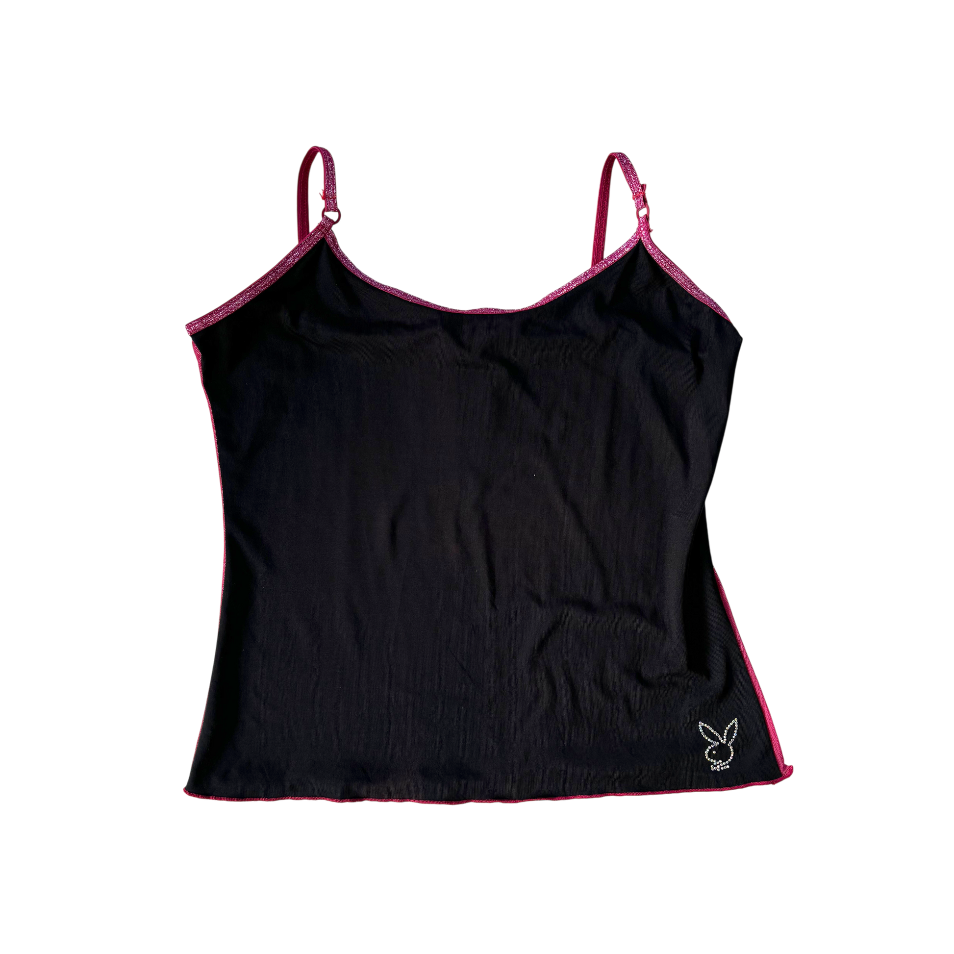 Super cute Playboy cami from their early 2000s intimates range. Slinky black front with rhinestone bunny. Adjustable straps. Hot pink glitter lining with mesh back.