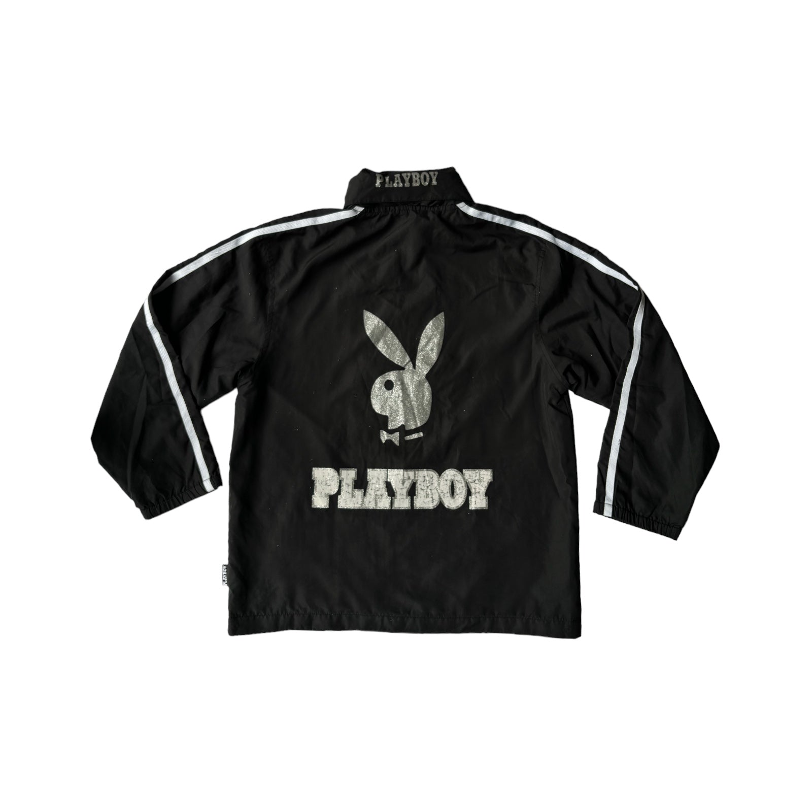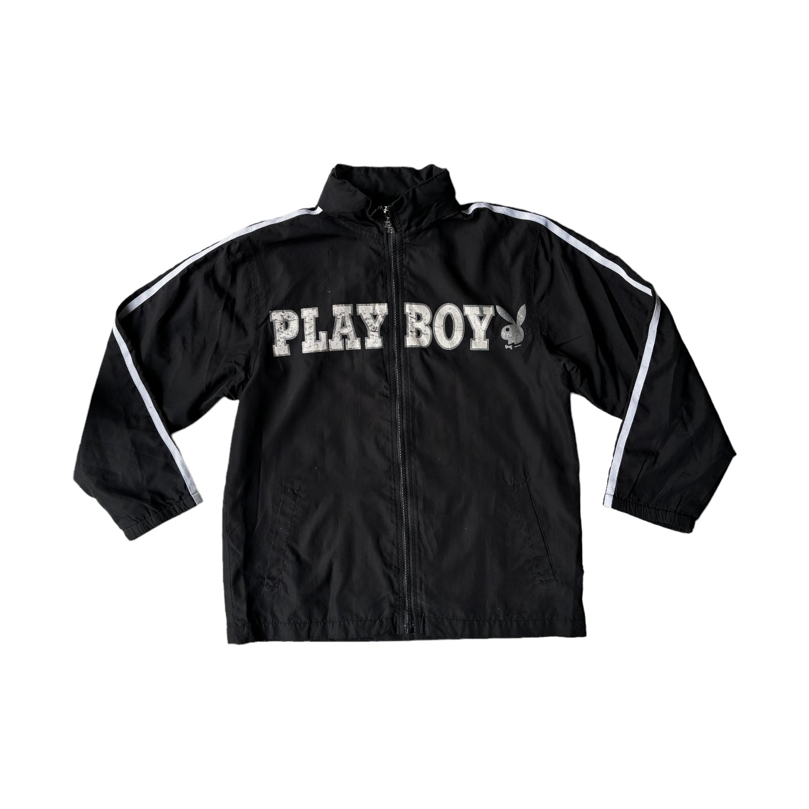 Iconic 2000s playboy jacket. White varsity 'Playboy' lettering with glitter detail. Intentional faded spatter style on graphics. Double striped arm design. 'PB' zipper charm. Silver Playboy bunny back graphic.
