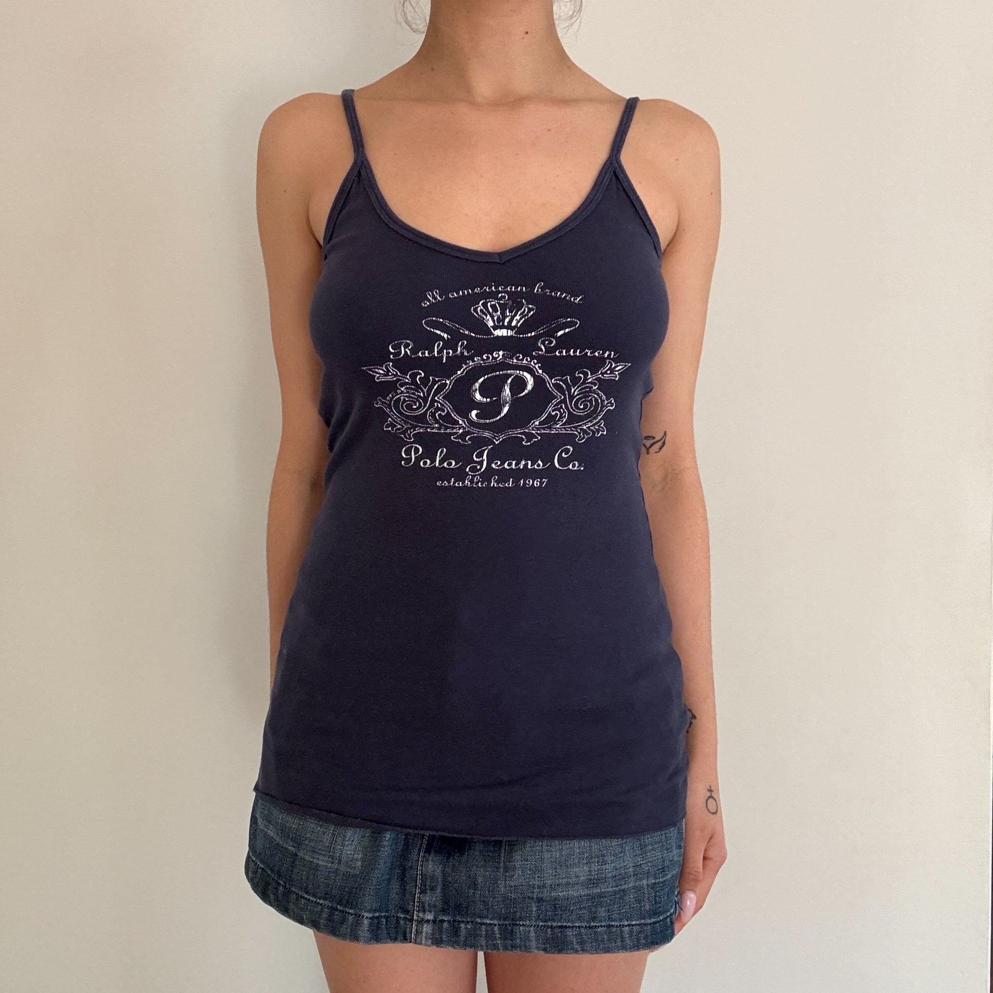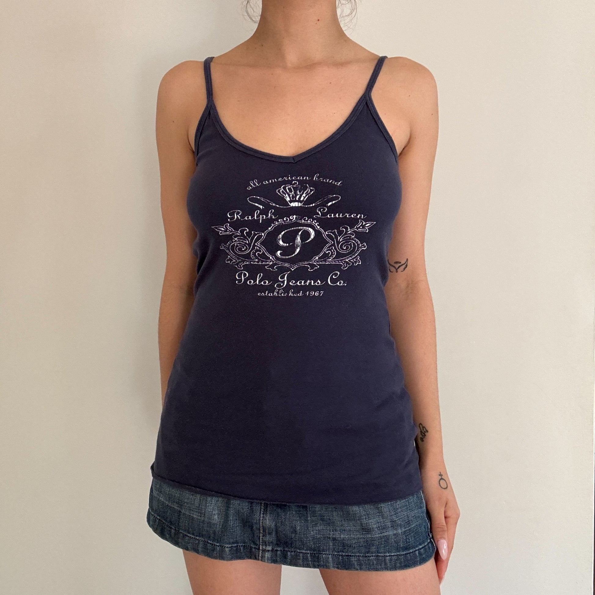 Polo Jeans Ralph Lauren singlet top in navy. Decorated logo emblem graphic. Minimalist 90s basic piece. Stretchy cotton material.